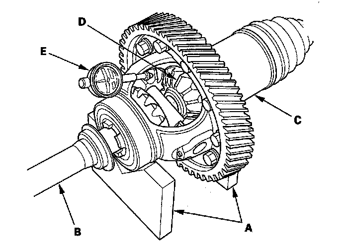 Backlash Inspection1. Place the differential assembly on V-blocks (A), and install the intermediate shaft (B) and left driveshaft (C).