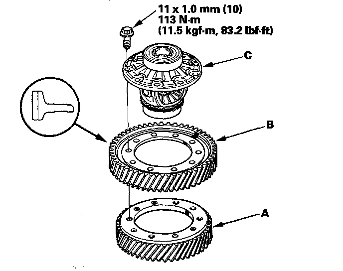 1. Remove the bolts (left-hand threads) in a crisscross pattern in several steps, then remove the transfer drive gear (A) and final driven gear (B) from the differential carrier (C).