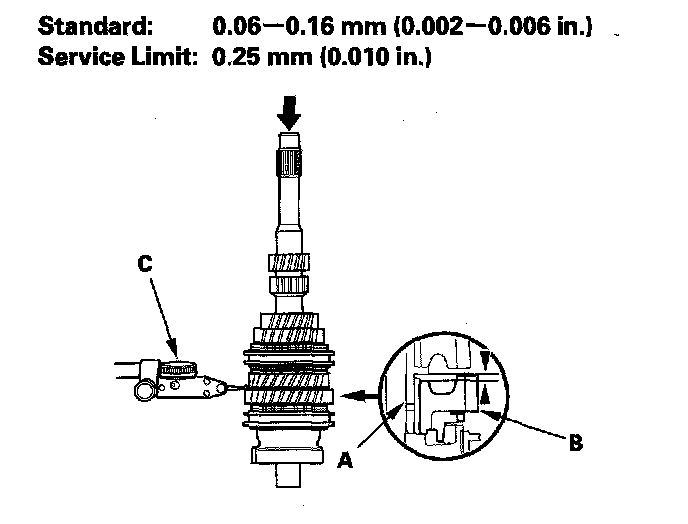 4. Measure the clearance between 4th gear (A) and the distance collar (B) with a dial indicator (C).