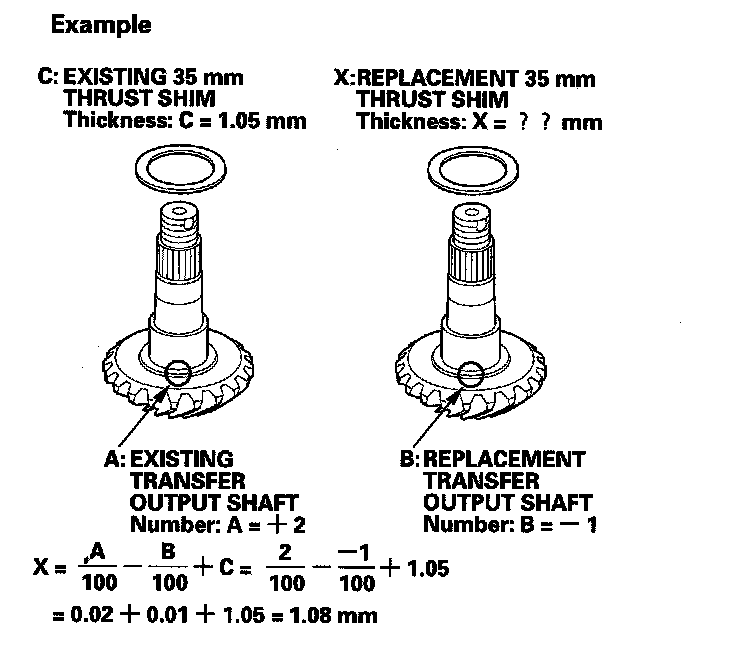 1. Select the 35 mm thrust shim if the transfer output shaft is replaced. Calculate the thickness of the 35 mm thrust shim using the formula, and select the shim from the table.