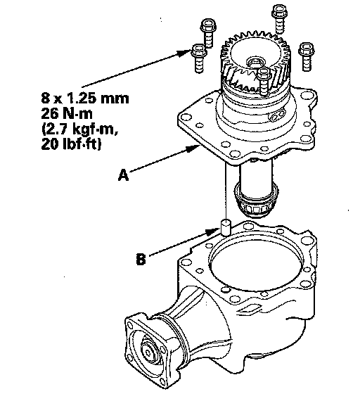 22. Remove the transfer holder (A) from the transfer housing (B) after adjusting the transfer gear backlash or transfer gear tooth contact.