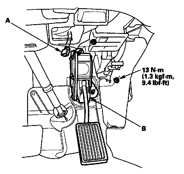 2. Remove the accelerator pedal module (B).