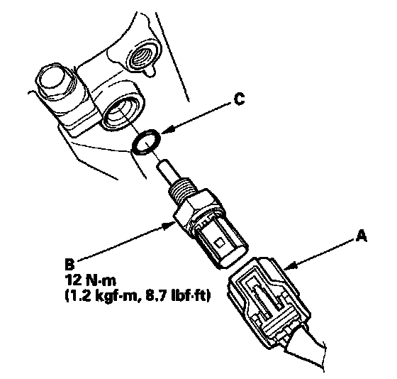 5. Install the parts in the reverse order of removal with a new O-ring (C), then refill the radiator with engine coolant.