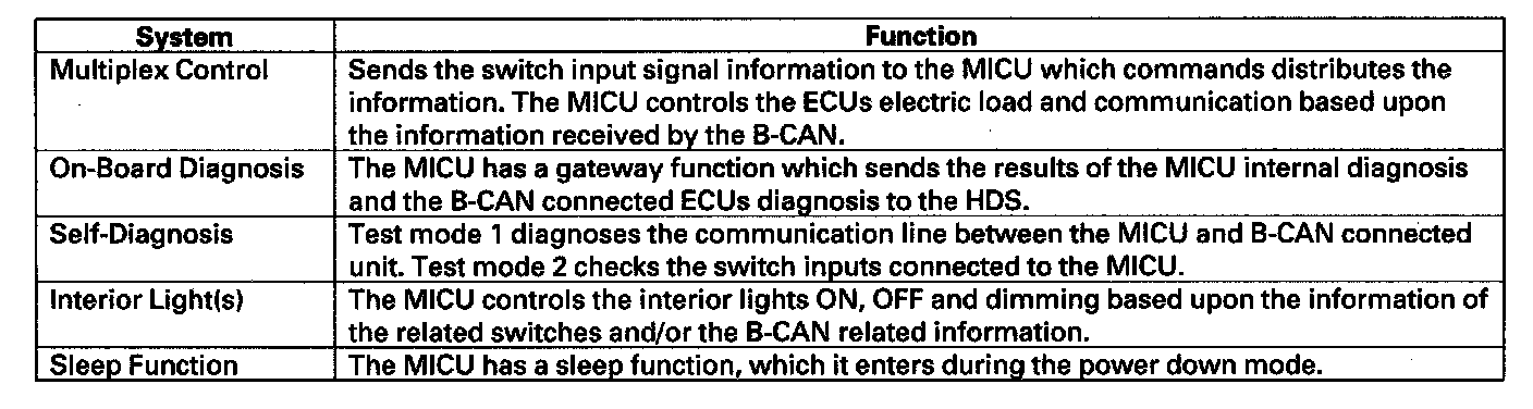The MICU (built into the under-dash fuse/relay box) is one of the B-CAN components. The MICU controls many systems related to the body controller area network, and also works as a gateway to diagnose the other B-CAN circuits with the HDS.