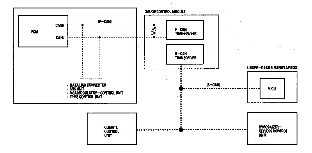 The body controller area network (B-CAN) and the fast controller area network (F-CAN) share information between multiple electronic control units (ECUs). B-CAN communication moves at a slower speed (33.33 kbps) for convenience related items and for other functions. F-CAN information moves at a faster speed (500 kbps) for "real time" functions such as fuel and emissions data. To allow both systems to share information, the gauge control module translates information from B-CAN to F-CAN and from F-CAN to B-CAN.