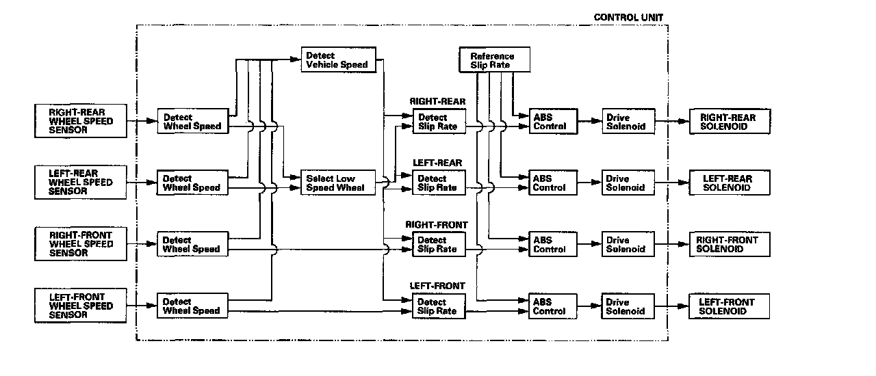The control unit calculates the slip rate of each wheel, and transmits the control signal to the modulator unit solenoid valve when the slip rate is high.
