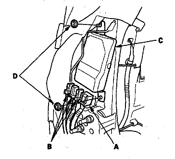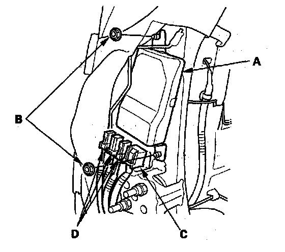 1. Place the new ODS unit (A) on the seat-back frame. Tighten the two nuts (B), and connect the ODS unit 18P connector (C) and sensor connectors (D) to the ODS unit.