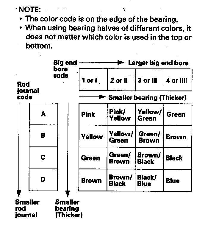 Each rod has a tolerance range from 0 to 0.024 mm (0.0009 in.), in 0.006 mm (0.0002 in.) increments, depending on the size of its big end bore. It's then stamped with a number or bar (1, 2, 3, or 4/I, II, III, or IIII) indicating the range. You may find any combination of numbers and bars in any engine. (Half the number or bar is stamped on the bearing cap, the other half is on the rod.)