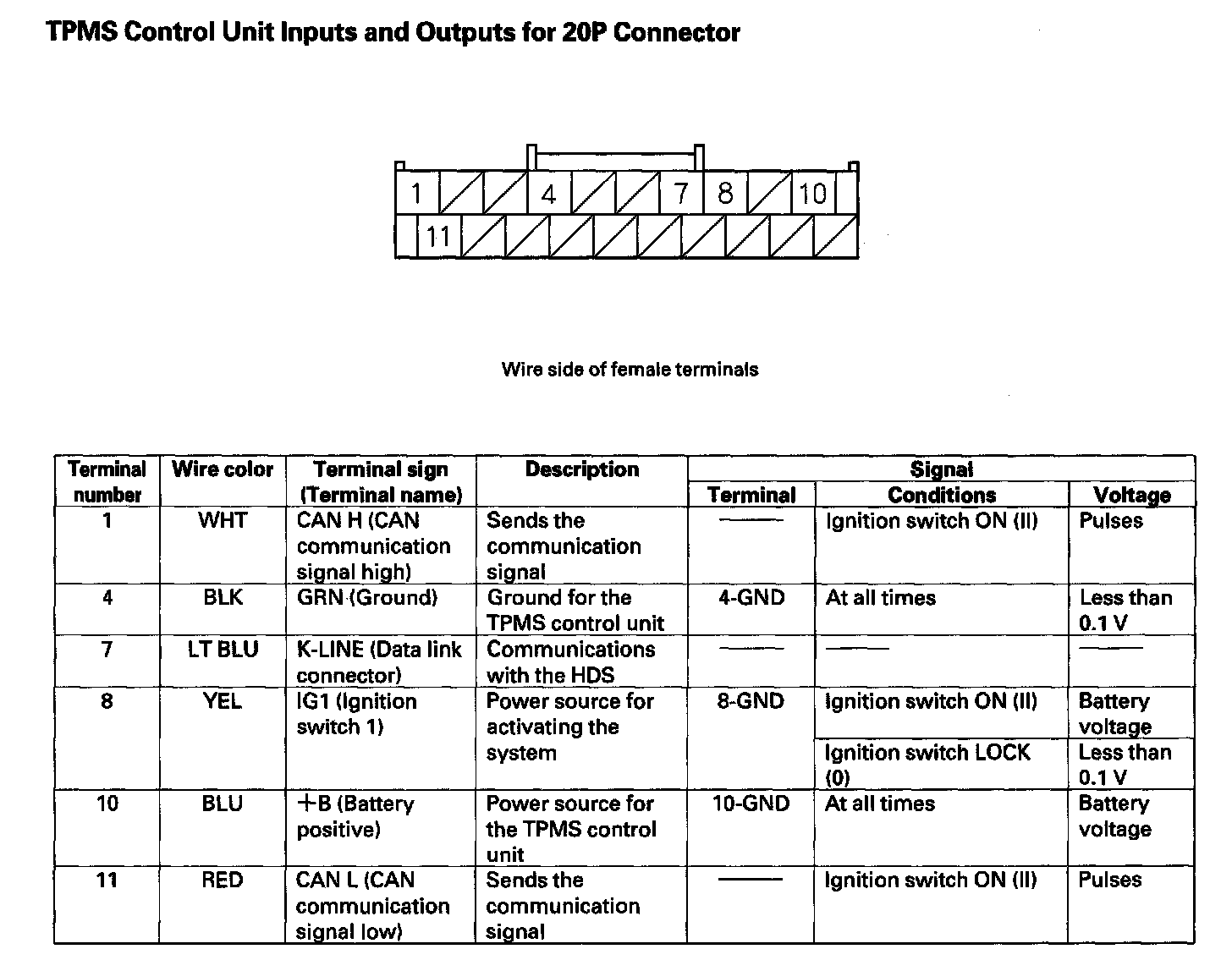 TPMS Control Unit Inputs and Outputs for 20P Connector: