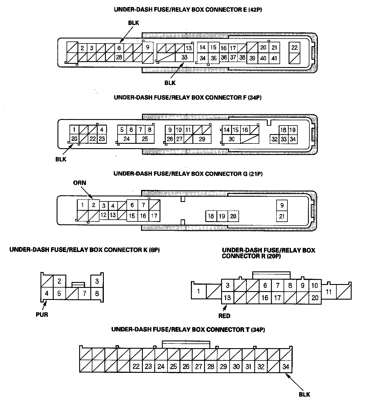 2. Disconnect under-dash fuse/relay box connectors E, F, G, K, R, and T.