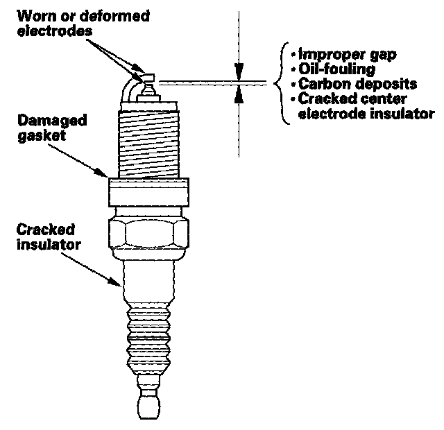Spark Plug Inspection1. Remove the spark plugs and inspect the electrodes and the ceramic insulator.