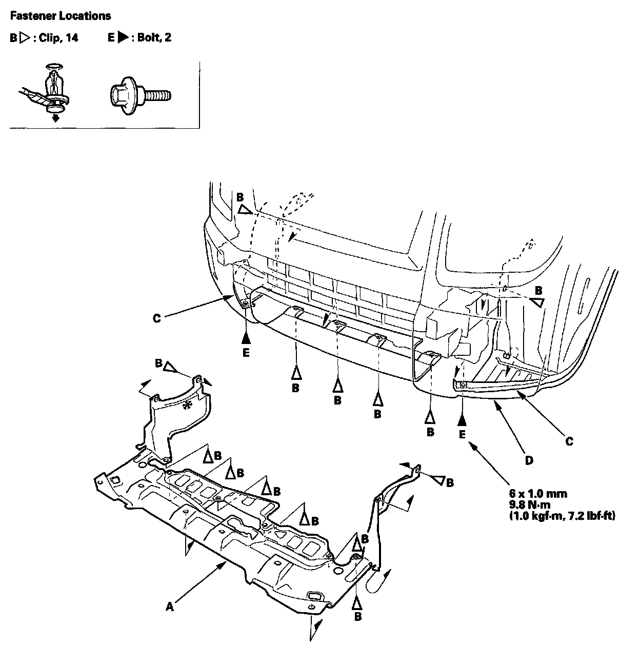 2. From under the front bumper (D), remove the clips (B) and bolts (E).