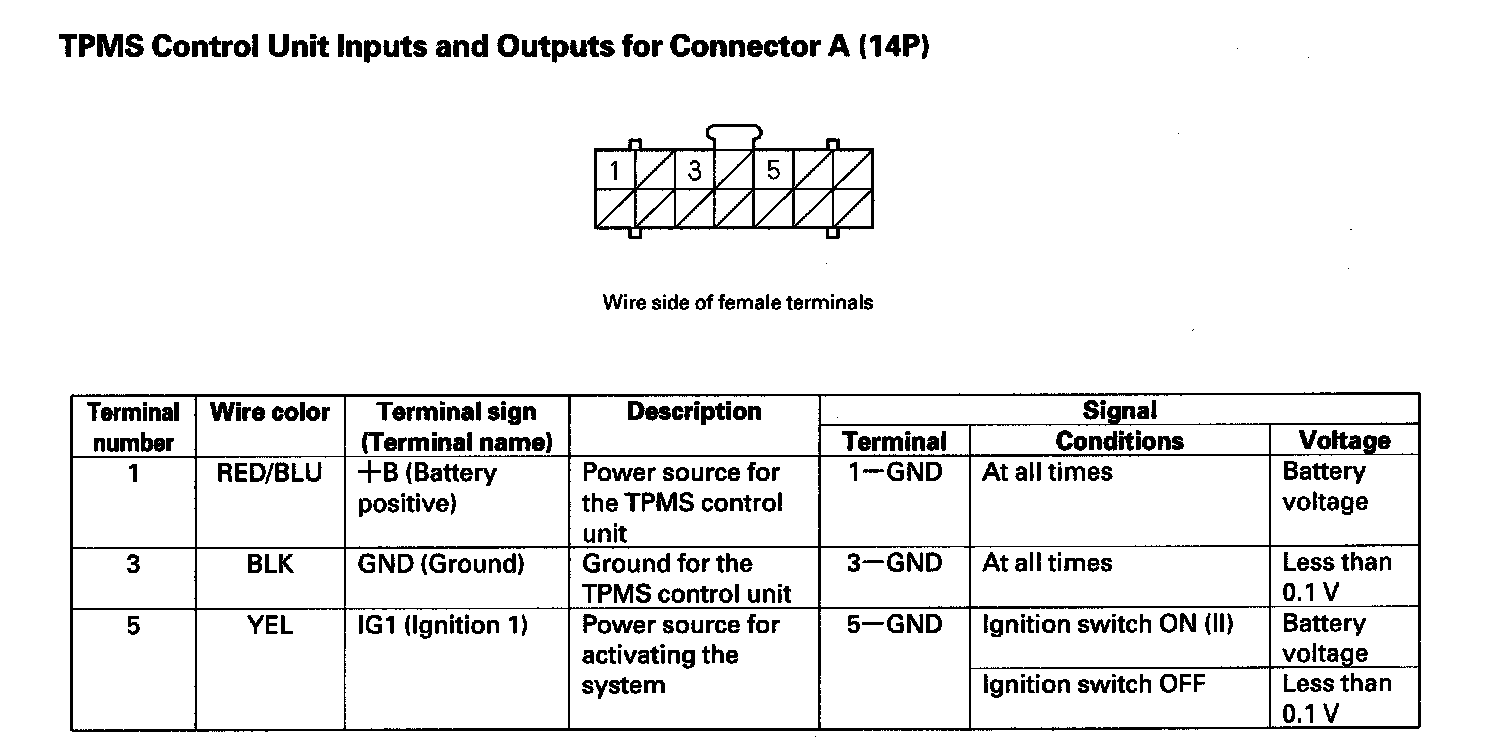 TPMS Control Unit Inputs and Outputs for Connector A (14P):