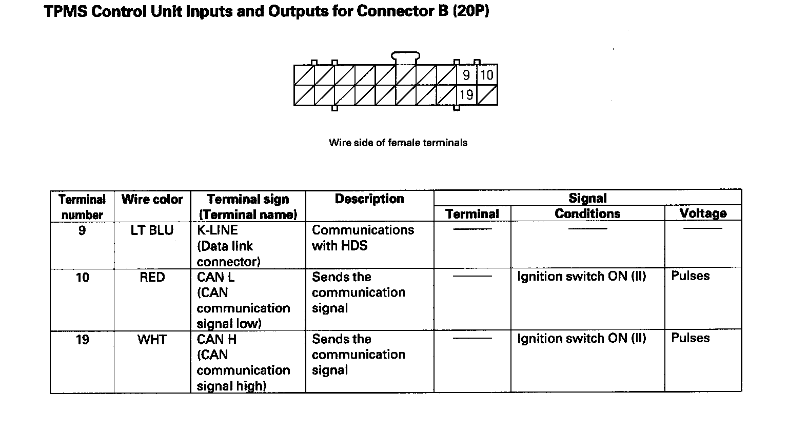 TPMS Control Unit Inputs and Outputs for Connector B (20P):