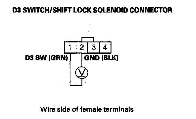 10. Measure the voltage between D3 switch/shift lock solenoid connector terminal No. 1 and body ground.