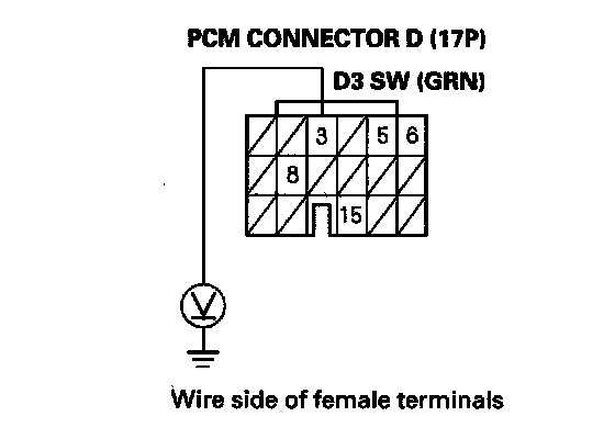11. Measure the voltage between PCM connector terminal D3 and body ground.