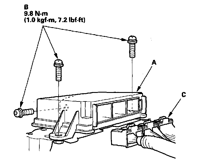 1. Install the new SRS unit (A) with TORX bolts (B), then connect the connectors (C) to the SRS unit; push them into position until they click.