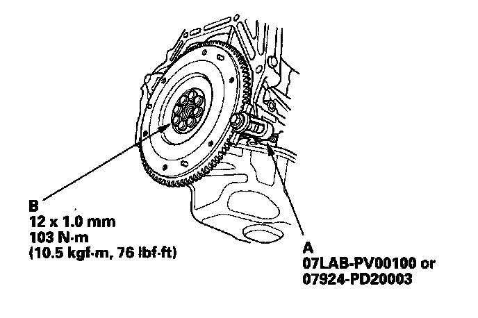 Torque the flywheel mounting bolts (B) in a crisscross pattern in several steps.