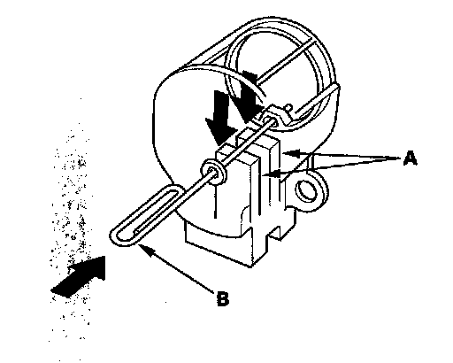 19. Push in the brushes (A), then insert a pin or drill bit (B) (about 1.6 mm (0.06 in.) diameter) to hold them there.