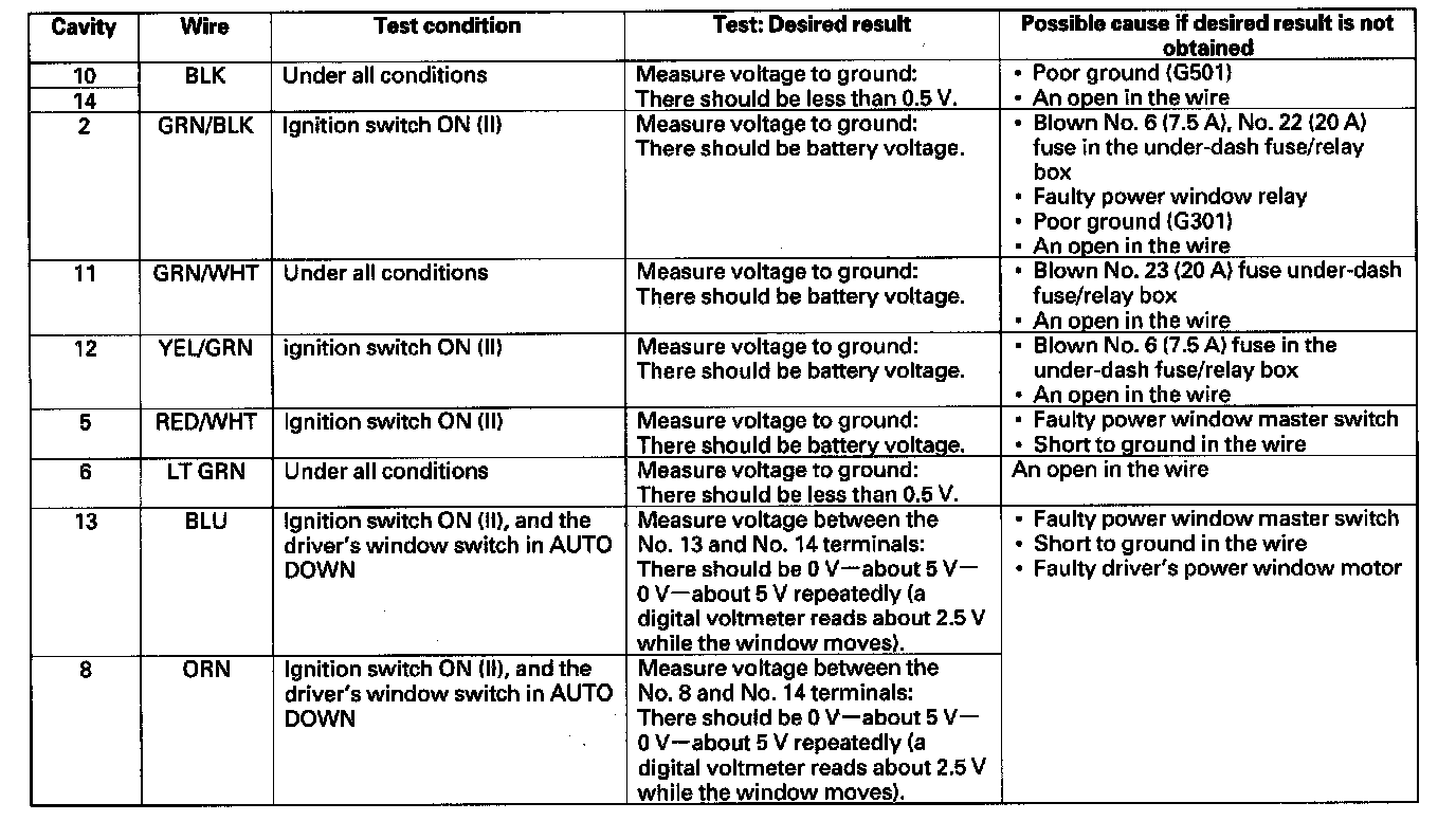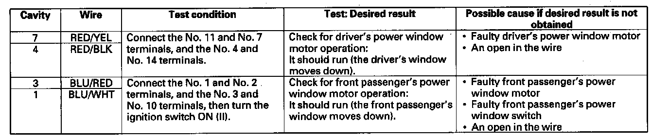 Power Window Master Switch Input TestNOTE: The power window control unit is built into the power window master switch, and it only controls the driver's window operations.