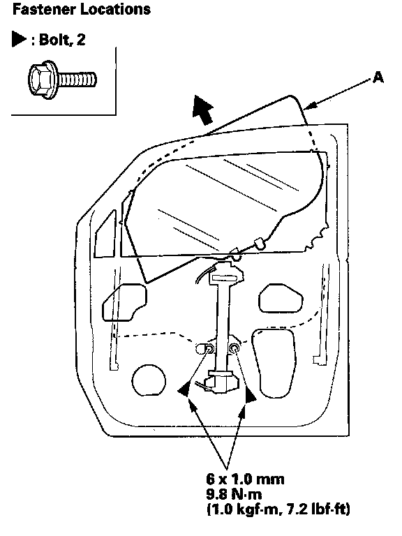 2. Carefully lower the glass (A) until you can see the bolts, then remove them. Carefully pull the glass out through the window slot. Take care not to drop the glass inside the door.