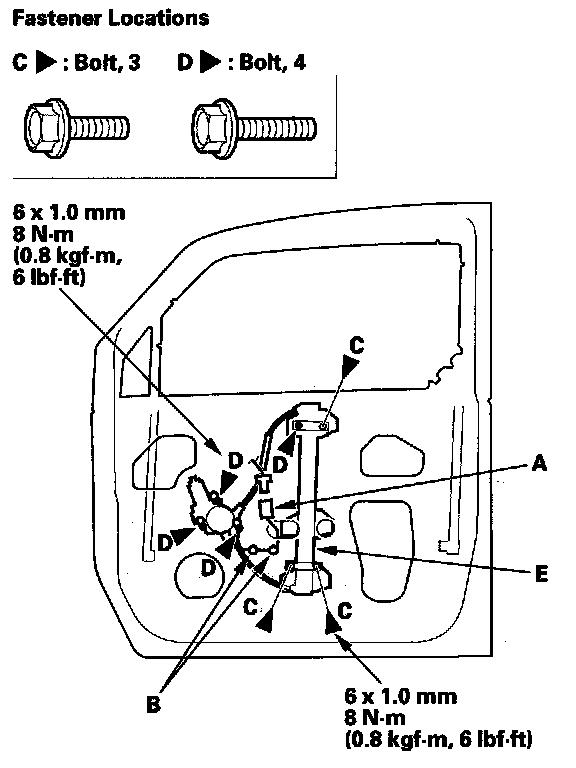 4. Remove the bolts (C), and loosen the bolts (D), then remove the regulator (E) through the hole in the door.
