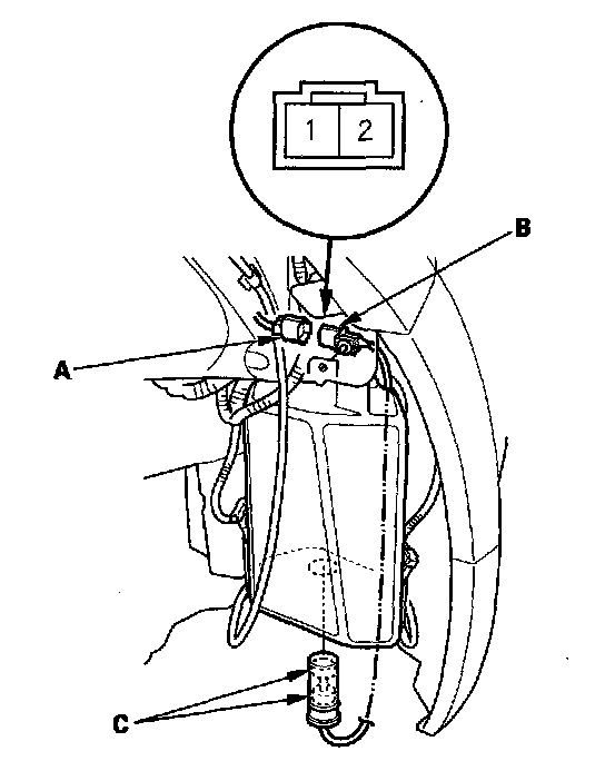 2. Disconnect the 2P connector (A) from the washer fluid level switch (B).