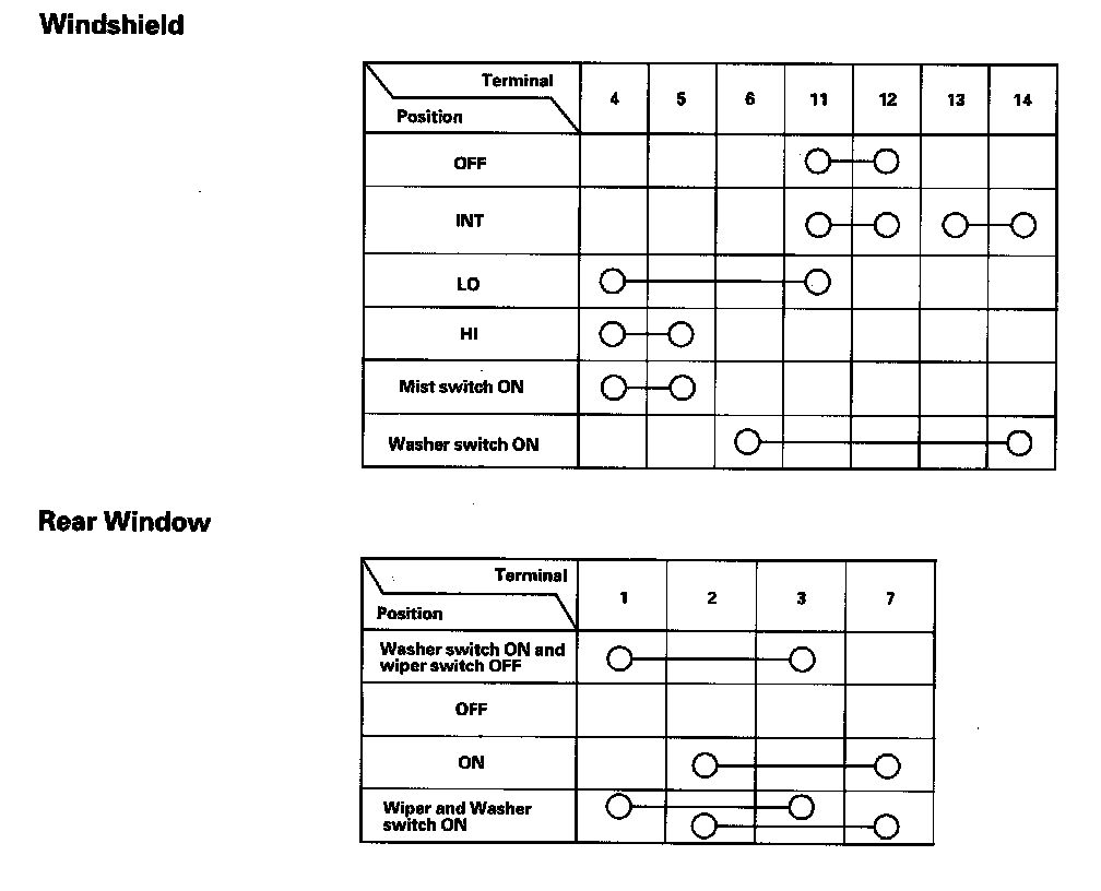 - If the terminals look OK, check for continuity between the terminals in each switch position according to the tables. If the continuity is not as specified, replace the switch.