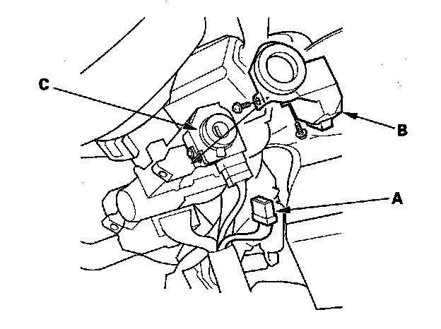 4. Remove the two screws and the immobilizer control unit-receiver from the ignition key cylinder (C).