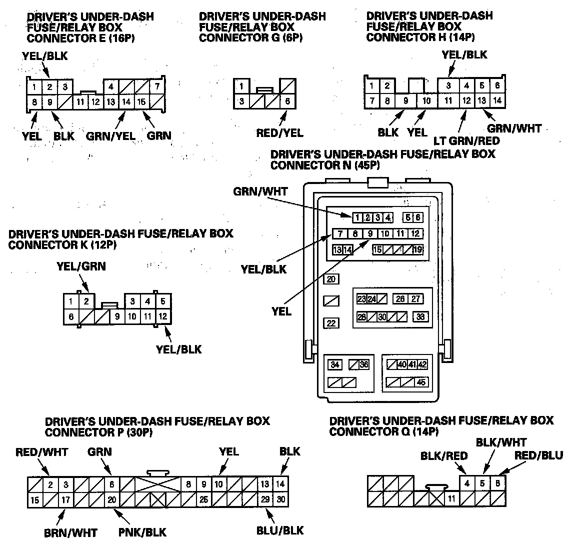 3. Disconnect driver's under-dash fuse/relay box connectors E, G, H, K, N, P, and Q.
