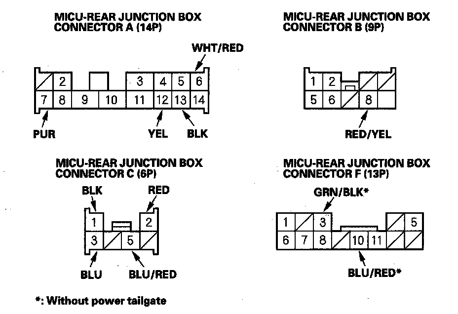 12. Reconnect all connectors to the MICU-rear junction box. Turn the ignition switch to ON (II), and make these input tests at the appropriate connectors on the MICU-rear junction box.