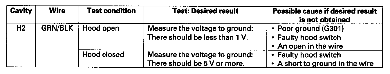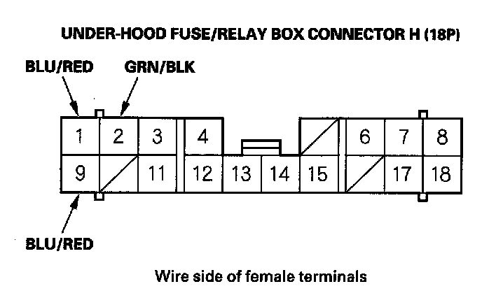 18. Reconnect the connector to the under-hood fuse/relay box, turn the ignition switch to ON (II) and make the input test at the appropriate connector on the under-hood fuse/relay box.