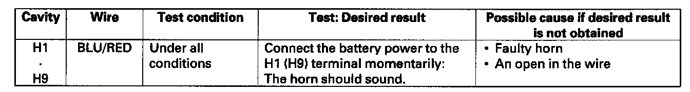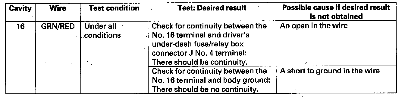 6. Reconnect all connectors to the driver's under-dash fuse/relay box. Turn the ignition switch to ON (II), and make these input tests at the appropriate connectors on the driver's under-dash fuse/relay box.