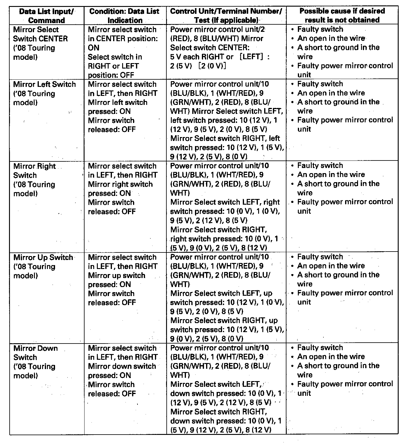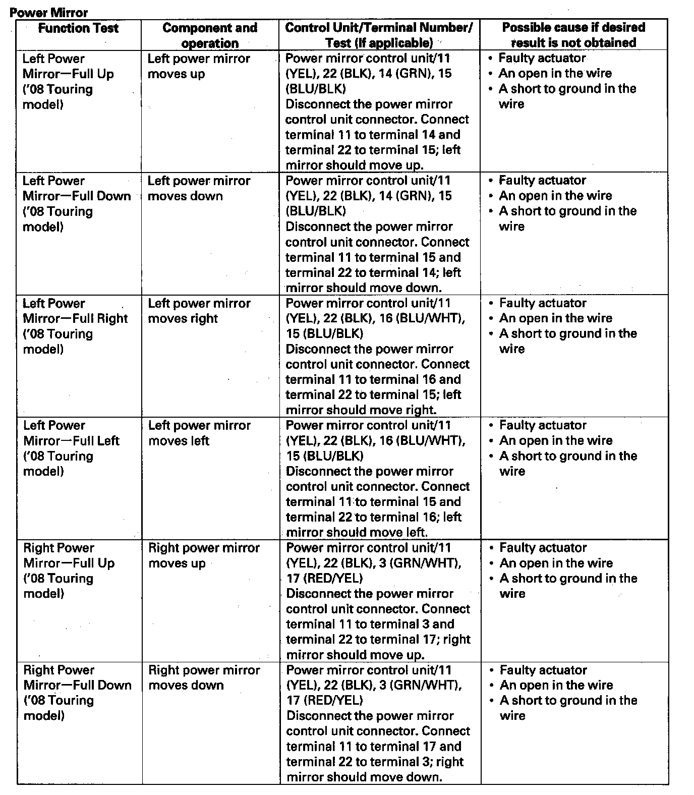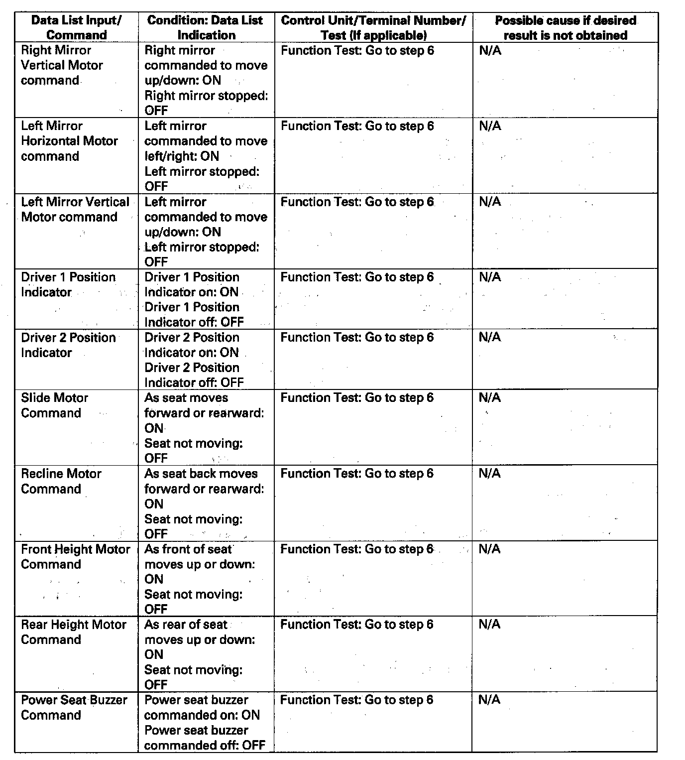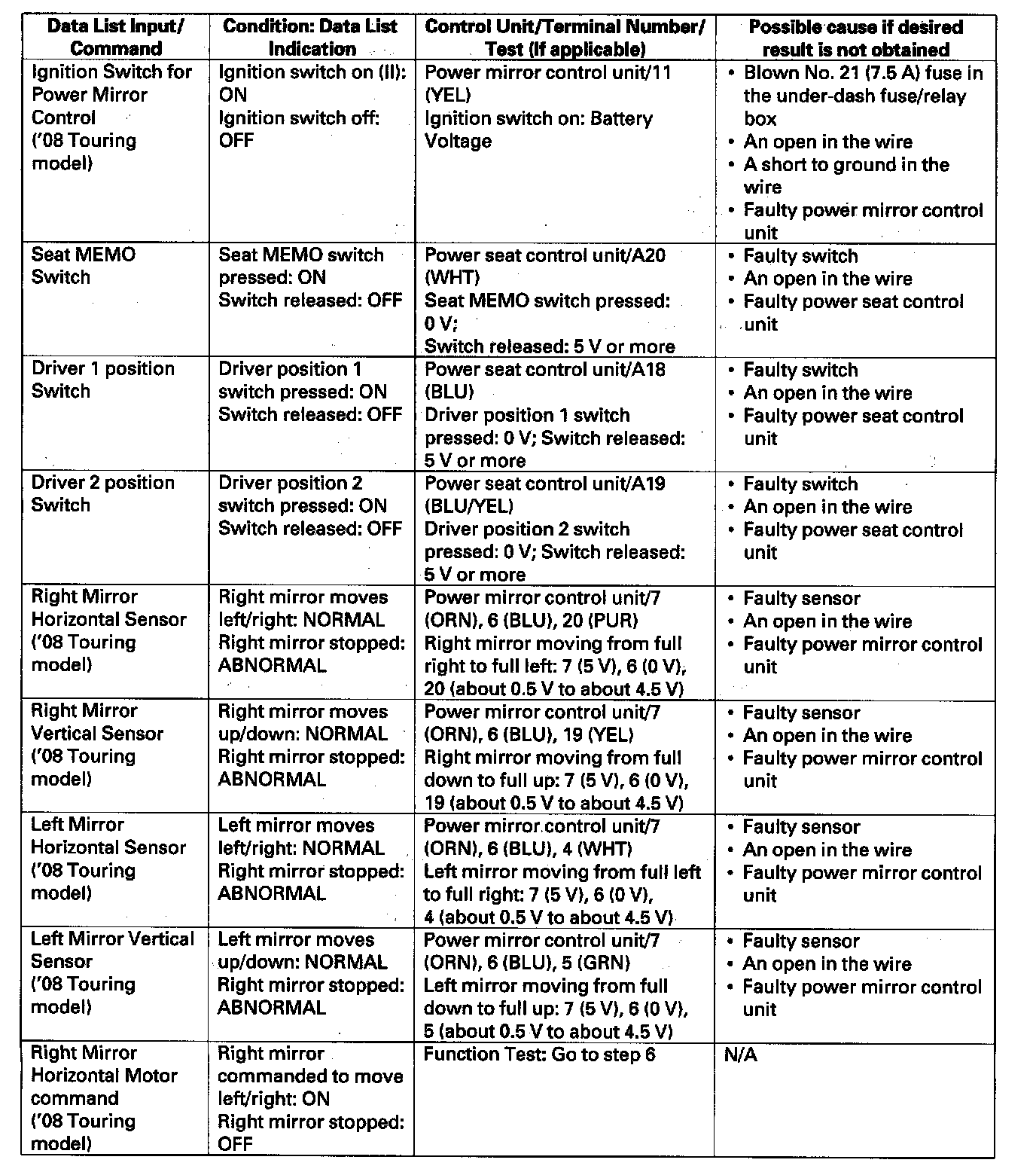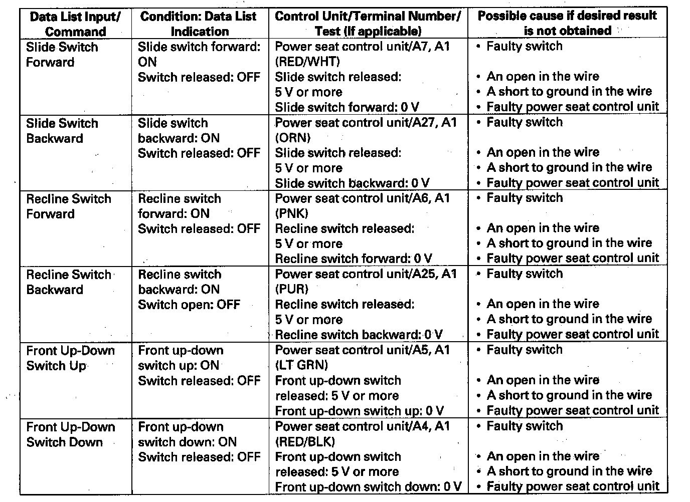 - If the function does not operate normally, perform the appropriate test at the control unit and terminal indicated in the table.