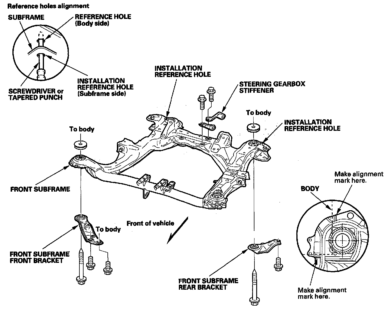 - When installing, align both installation reference holes in the subframe with the reference holes in the body using a screwdriver or tapered punch as a guide.