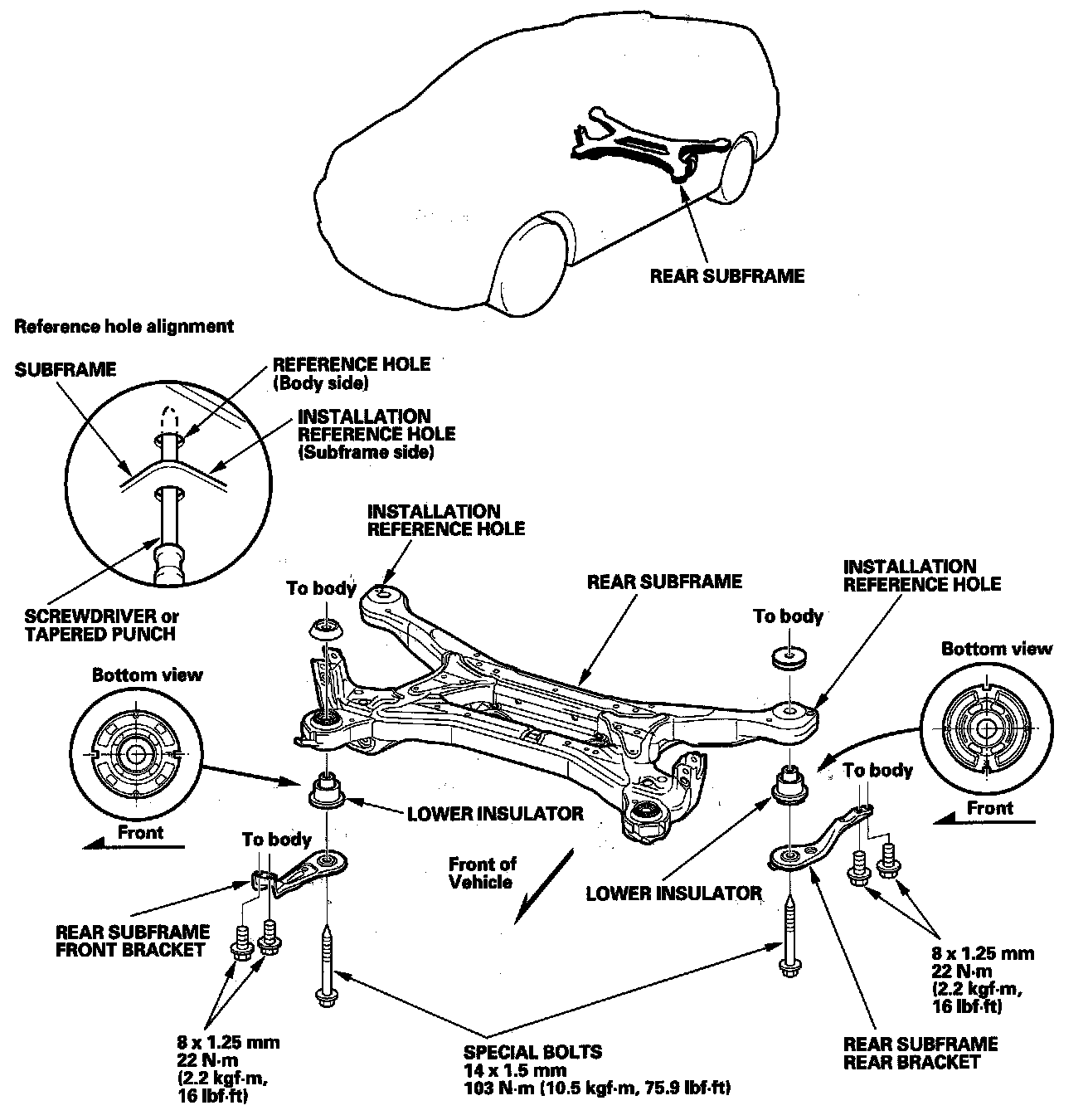 - After mounting the subframe and brackets loosely, align the reference marks with the body, then tighten the bolts.