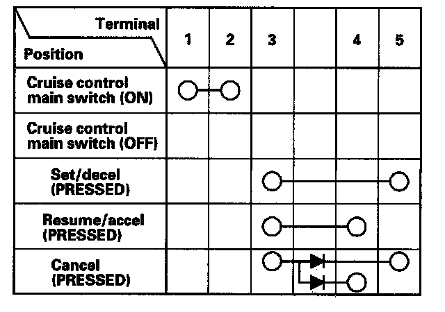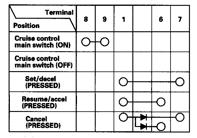 - If there is continuity, and it matches the table, but switch failure occurred on the cruise control input test, check and repair the wire harness on the switch circuit.