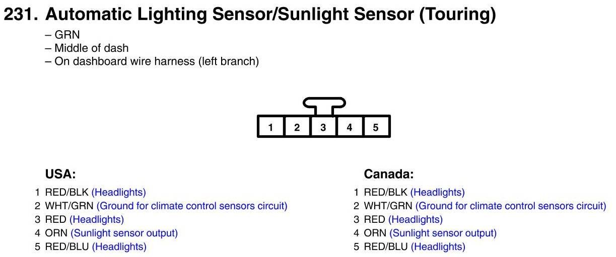 View 231 - Automatic Lighting Sensor/Sunlight Sensor Connector View (Touring)