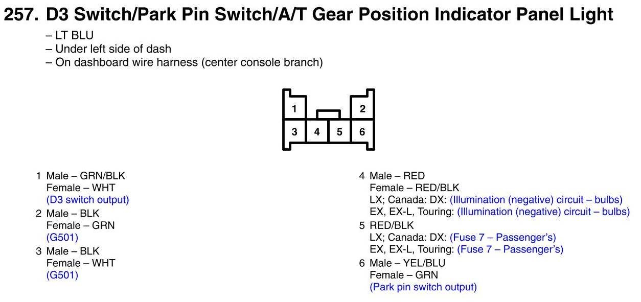 View 257 - D3 Switch/Park Pin Switch/A/T Gear Position Indicator Panel Light Connector View
