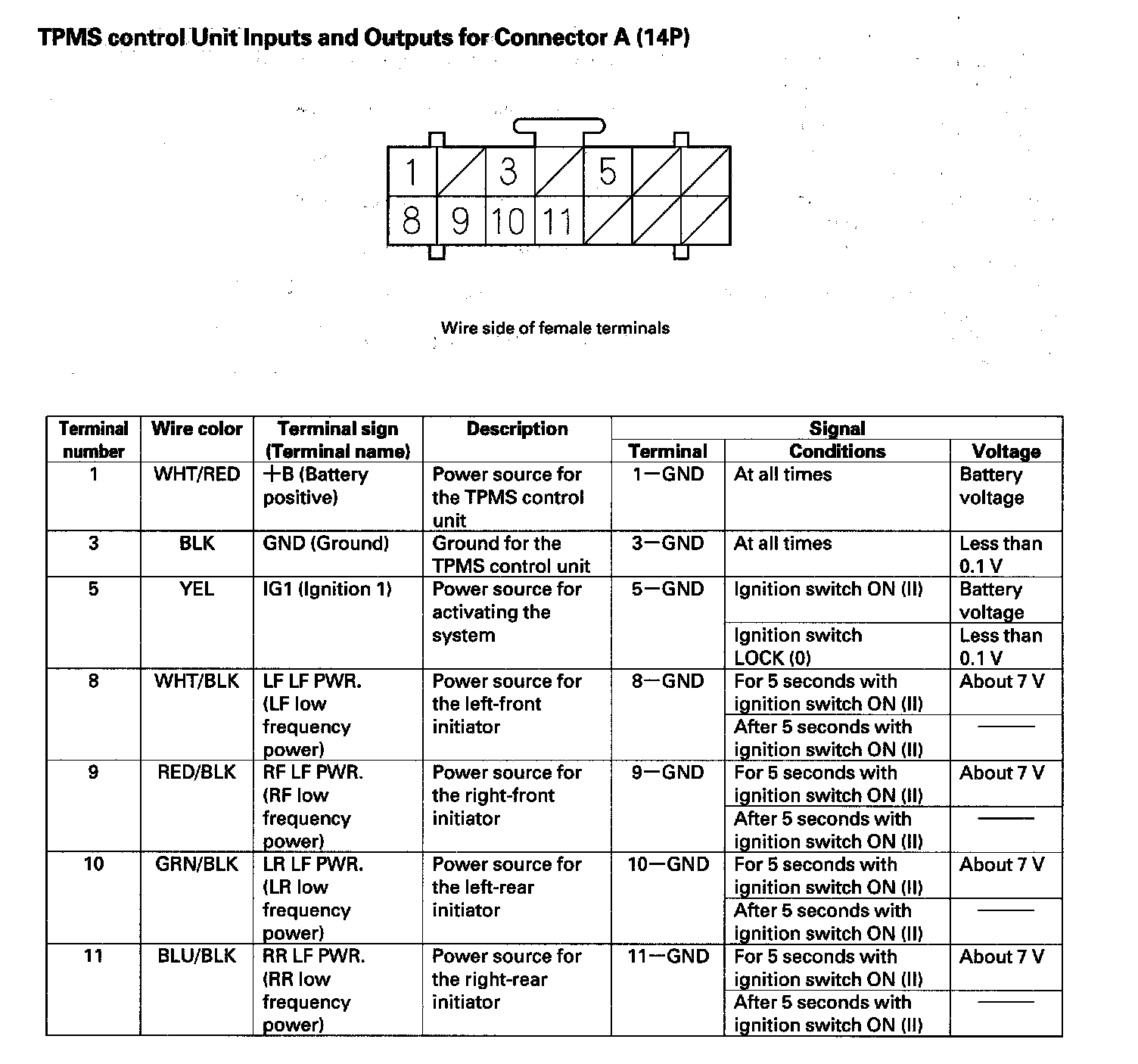 TPMS Control Unit TPMS Control Unit Inputs And Outputs For Connector A (14P):