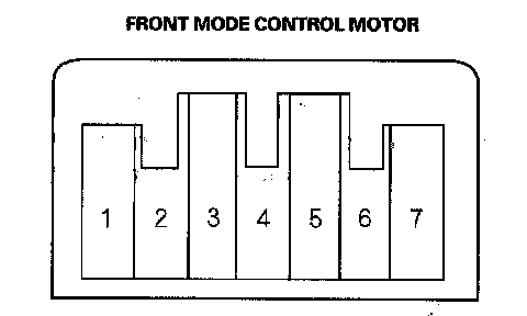 2. Connect battery power to the No. 1 terminal of the front mode control motor, and ground the No. 2 terminal; the front mode control motor should run smoothly, and stop at Vent. If it doesn't, reverse the connections; the front mode control motor should run smoothly, and stop at Defrost. When the front mode control motor stops running, disconnect battery power immediately.