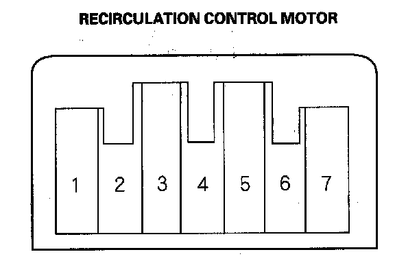 2. Connect battery power to the No. 1 terminal of the recirculation control motor; and ground the No. 5 and No. 7 terminals; the recirculation control motor should run smoothly. To avoid damaging the recirculation control motor, do not reverse power and ground. Disconnect the No. 5 or No. 7 terminals from ground; the recirculation control motor should stop at Fresh (when the No. 7 terminal is disconnected) or Recirculate (when the No. 5 terminal is disconnected). Don't cycle the recirculation control motor for a long time.