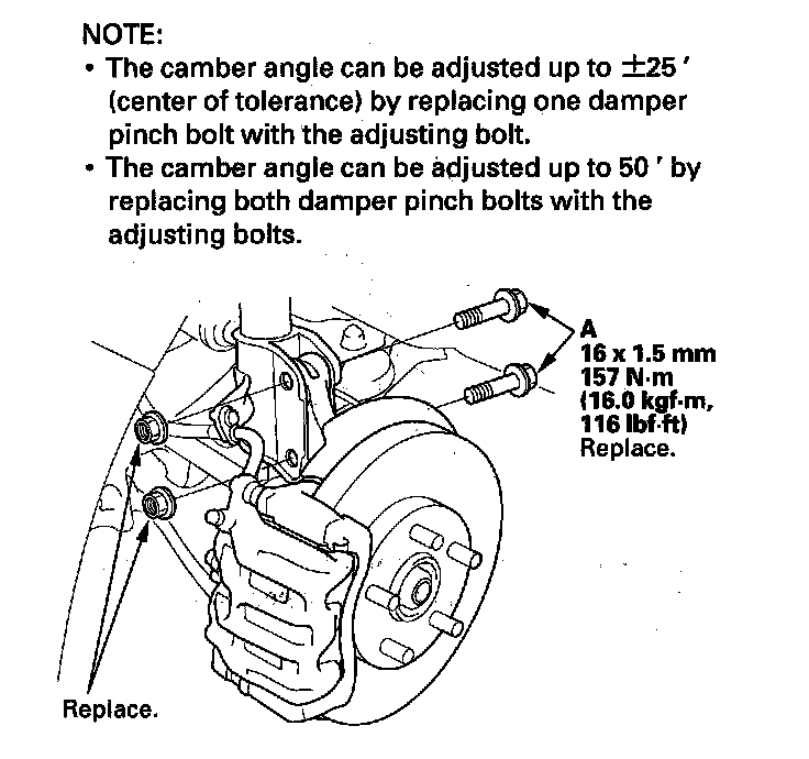The front camber can be adjusted by exchanging one or both of the damper pinch bolts with a smaller diameter adjusting bolt. The difference between the adjusting bolt diameter and the pinch bolt hole diameter allows for a small range of adjustment.