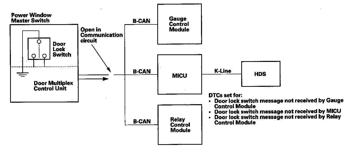 Since there is a break in the communication circuit, the door lock switch message could not be received by the gauge control module, multiplex integrated control unit (MICU), or the relay control module. Each of these units will set "loss of communication" error codes for the message(s) they did not receive. There may be multiple communication DTCs if the unit that has become disconnected from the network would normally transmit multiple messages during the communication line test. For example, the door multiplex control unit sends the keyless panic message and door lock switch message during the communication circuit test.