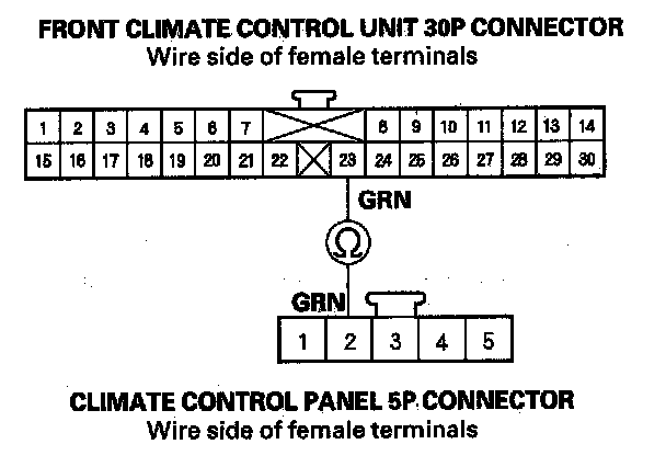 5. Check for continuity between the No. 23 terminal of the front climate control unit 30P connector and the No. 2 terminal of the climate control panel 5P connector.