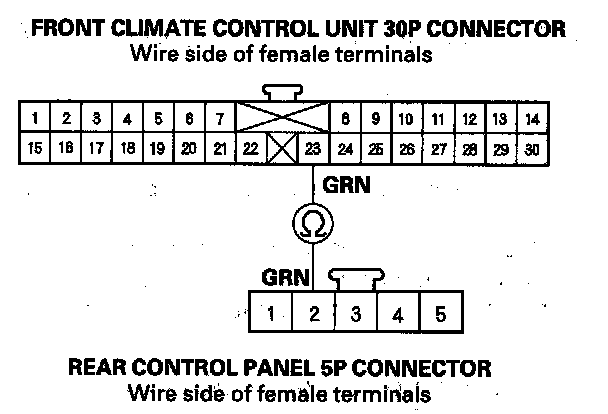 NO - Repair an open in the wire between the front climate control unit 30P connector and the rear control panel 5P connector.