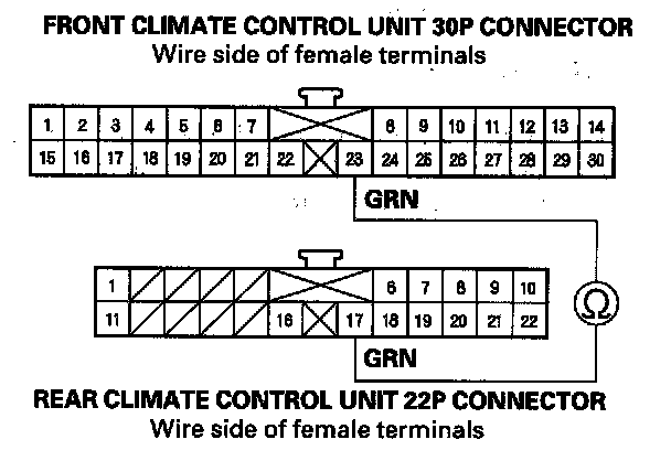 7. Check for continuity between the No. 23 terminal of the front climate control unit 30P connector and the No. 17 terminal of the rear climate control unit 22P connector.