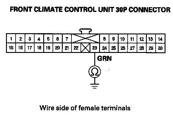 8. Check for continuity between the No. 23 terminal of the front climate control unit 30P connector and body ground.