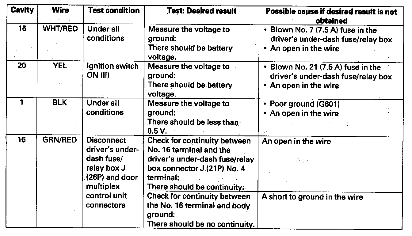 Door Multiplex Control Unit Input TestNOTE: Make sure the ignition switch is turned to LOCK (0) before disconnecting the driver's door switch panel.