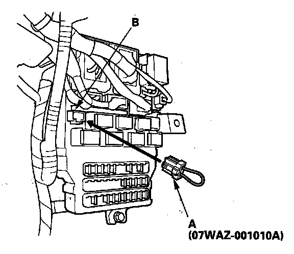 4. Connect the MPCS service connector (A) to the MCIC socket (B) in the driver's under-dash fuse/relay box.